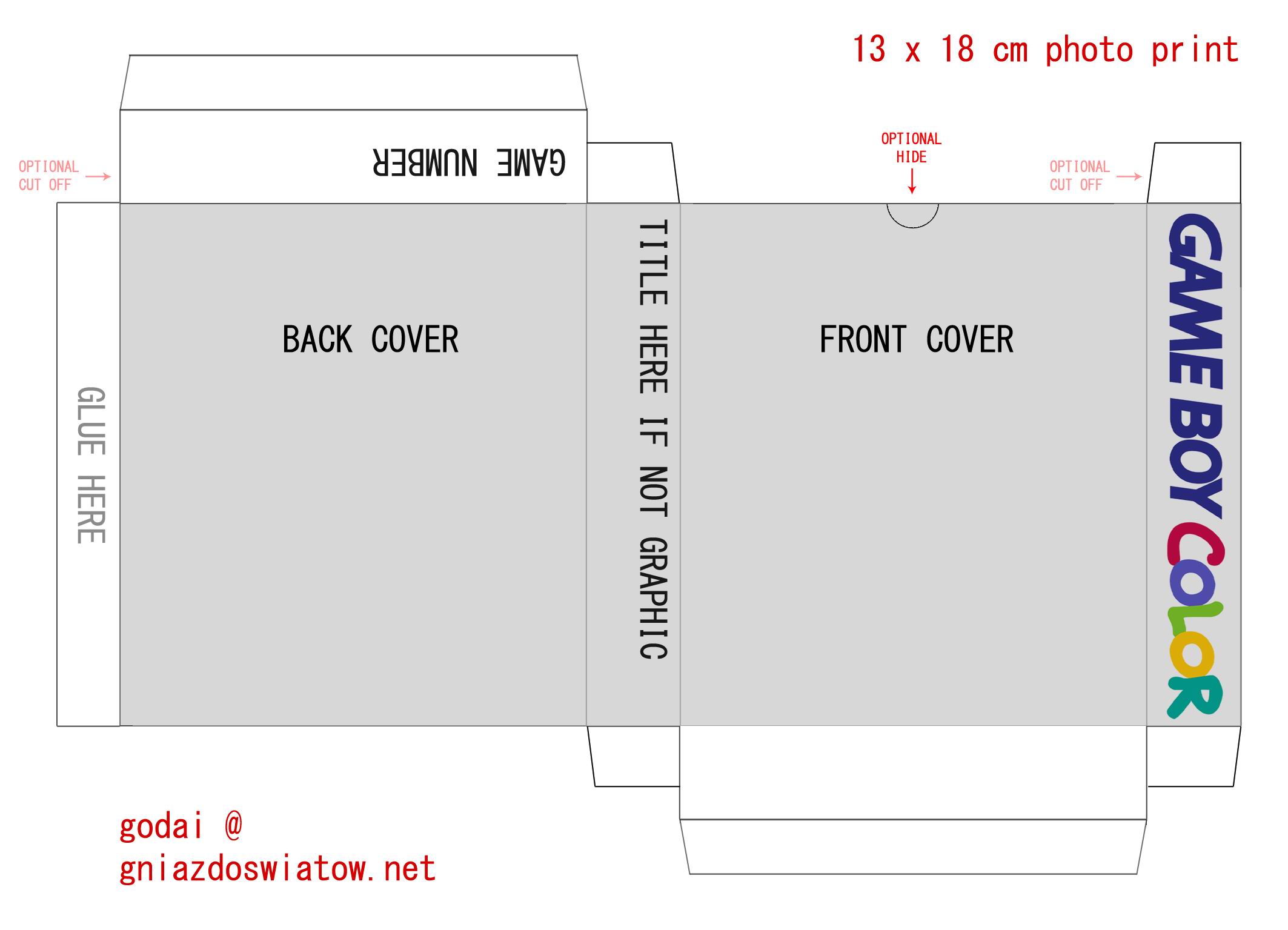Jest to wersja maximum, to znaczy pozwala na zrobienie pudełka z pokrywkami od góry i dołu. Można te skrzydełka wykorzystać, albo nie – dowolnie. Można też zrobić wcięcie ułatwiające otwieranie, jeśli zdecydujecie się na pudełko zamykane. Na etapie wypełniania projektu grafiką można te elementy wykorzystać lub pominąć. Wzornik pozwala wybrać logo GB albo GBC na jednym z boków. Na drugim osobiście lubię umieszczać tytuły gier, ale to rzecz gustu. Także numer produkcji możecie wrzucić gdzie wam się podoba, albo zrezygnować z niego.