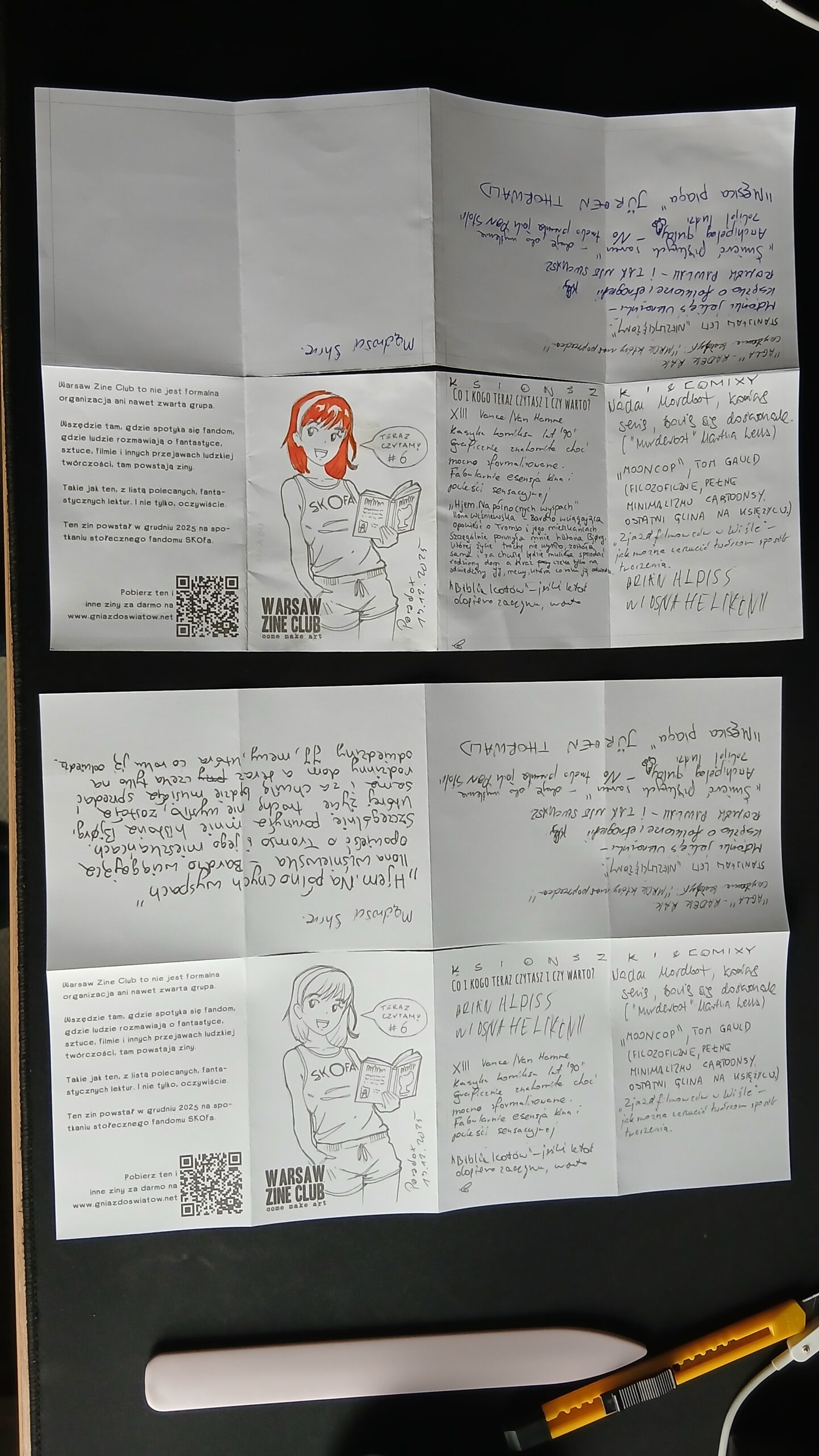 Tym razem spisane na SKOFie polecanki czytelnicze wyglądały trochę chaotycznie (górny egzemplarz), ale tak jest, jak Warsaw Zine Club spotyka się przy piwie a w dodatku pada chyba rekord ilości.Jedna sekcja pusta, na pierwszej stronie takim maczkiem, ze xero tego w życiu nie uciągnie, cóż, trzeba było puścić w ruch nożyczki, trochę wyczyścić, trochę powiększyć, dać oddech tu i tam i na dole widzicie efekt. 30 minut roboty i z tej listy polecanych lektur będzie pożytek, jak zostanie rozdana na spotkaniu za miesiąc.