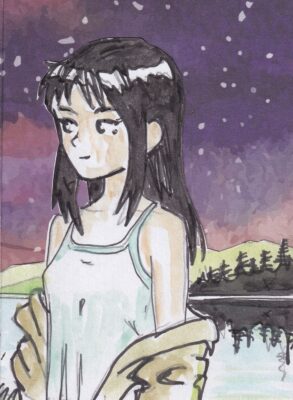 | 07 — Girl by the lake Inks + watercolors on printed background |